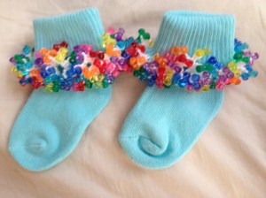 Socks I made for a newborn in our ward. Kohl wanted me to make them Rainbow Dash colors.