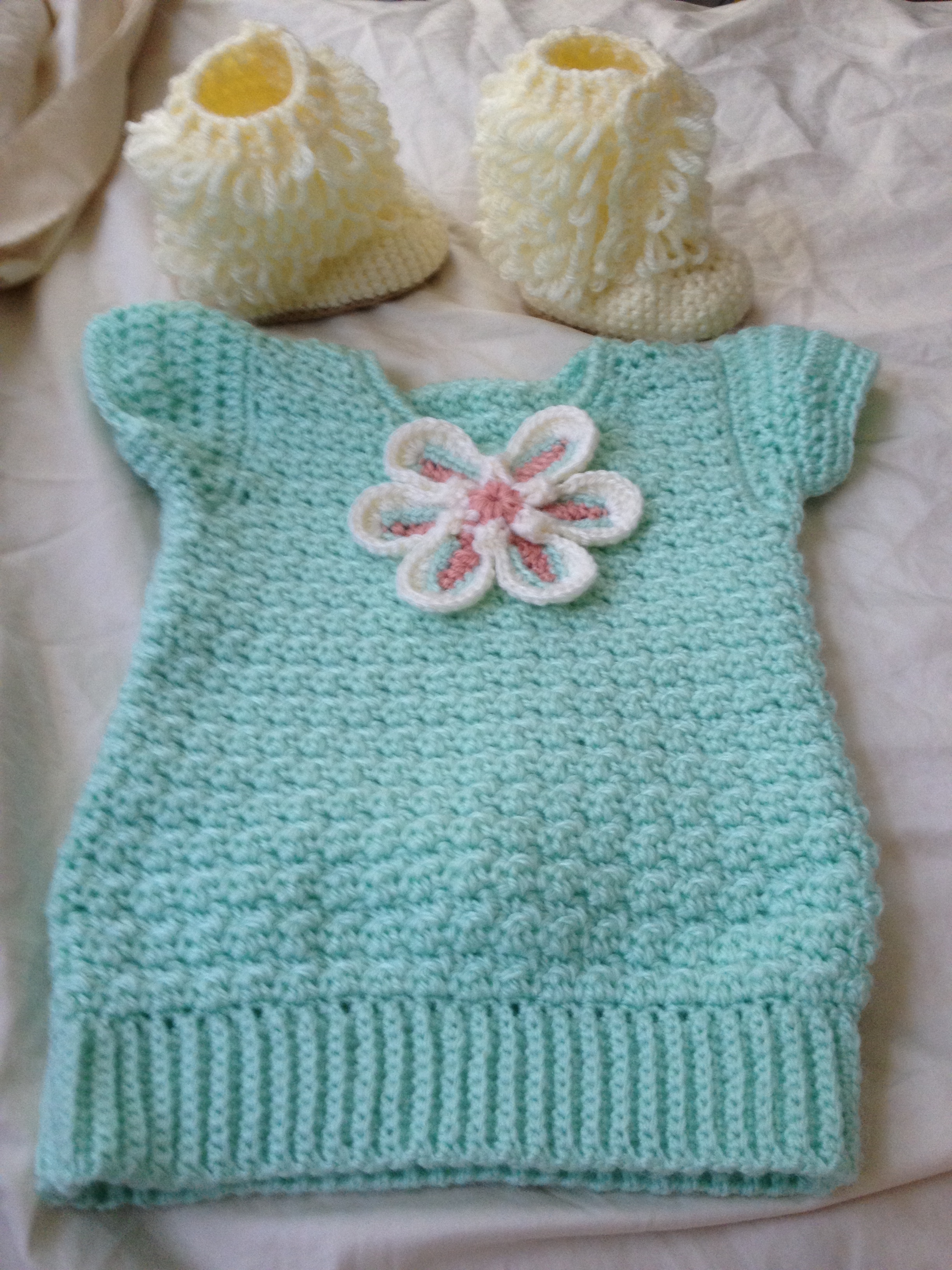 A tunic and furry boots I made for one of my friends who is about to have a baby girl. I gave her some pink leggings to go with it too.