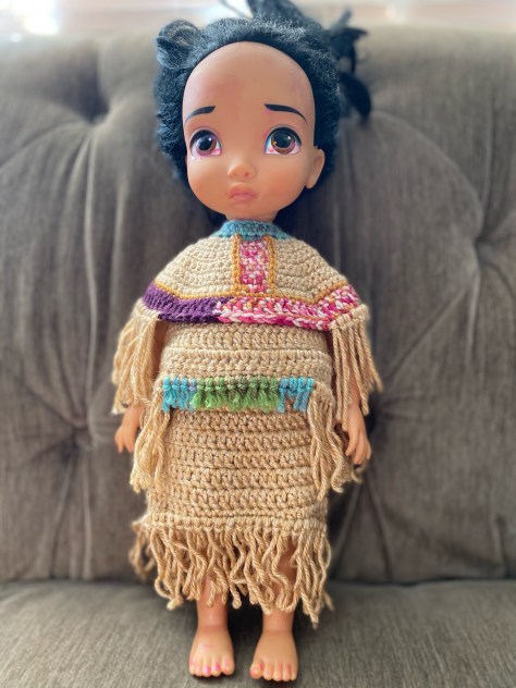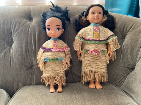 I used variegated yarn to simulate the beading that often went on these dresses and long fringe which was very common. I made two different sizes: one for the 16″ Disney doll and one for the 18″ doll.