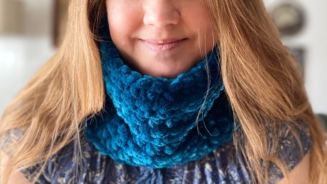 What I discovered over the next winter was that these simple cowls made my outfits shine. They were crafted in only one color using a very simple stitch, usually half double crochet, to avoid distracting from the luxurious texture of the velvet. The soft, somewhat heavy feel of the yarn was comforting, and a cowl is super utilitarian because it protects your neck so well from those icy drafts that winter loves surprising you with. Imagine my surprise then when, even when I threw one on with a hoodie and rain boots to take my daughter to school, I received compliment after compliment. The very simplicity of these easy, sturdy projects in their luscious yarn and vibrant colors made me look more sophisticated.