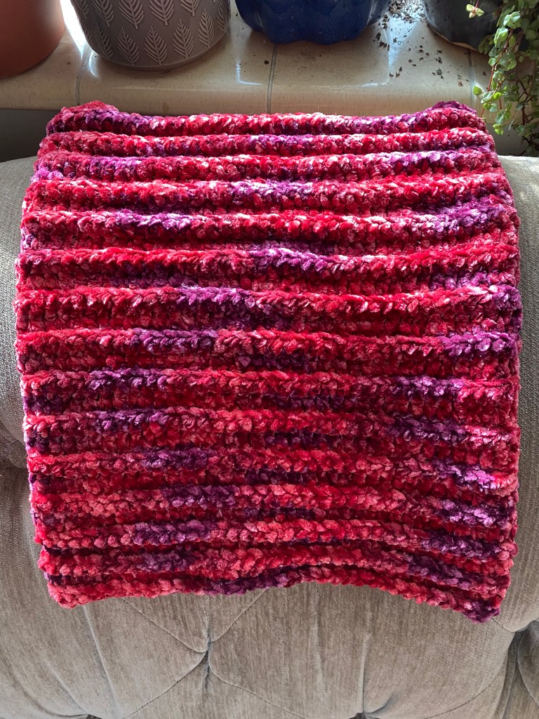 1 skein Bernat Crushed Velvet (size 5 bulky) yarn. I used Cranberry Cider in these pictures.